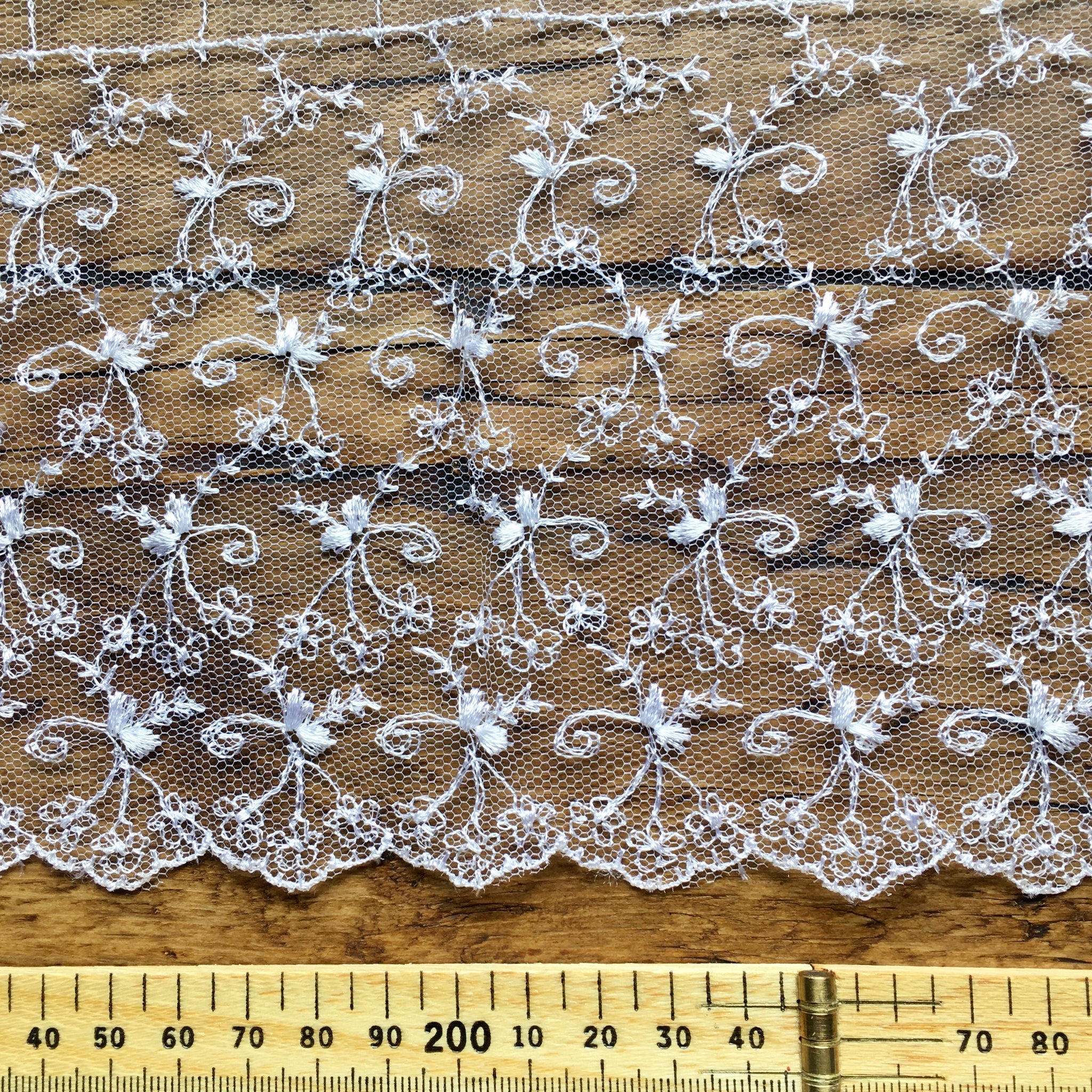 Delicate embroidered lace on a tulle background in pure white. The tulle has slight stiffness to give body making it perfect for gathering.